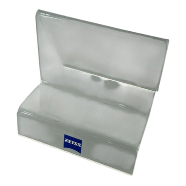 Transparante vintage displaystandaard van Carl Zeiss, ideaal voor het presenteren van lenzen, brillen, accessoires of optische apparatuur. Gemaakt van helder acryl met het klassieke blauwe Zeiss-logo aan de voorzijde.