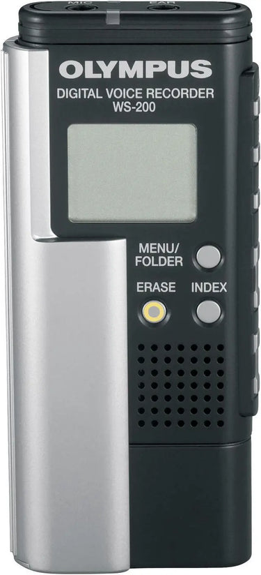 De Olympus WS-200S Digital Voice Recorder is een compacte digitale voice-recorder met 128 MB intern geheugen, geschikt voor het opnemen van tot bijna 55 uur spraak in de zuinige LP-modus of ruim 4 uur in stereokwaliteit. Het apparaat heeft een ingebouwde stereomicrofoon, een USB-aansluiting waarmee bestanden direct naar de computer overgezet kunnen worden, en werkt tevens als USB-opslagapparaat. Dankzij functies als VCVA-spraakgestuurde opname, indexmarkeringen en de mogelijkheid tot het beheren van vijf mappen met elk 199 bestanden, biedt deze recorder veel gebruiksgemak. Met een gewicht van slechts 54 gram en een werking op één AAA-batterij is dit model ideaal voor dictaten, interviews en college-opnames, en aantrekkelijk voor liefhebbers van klassieke opnameapparatuur.