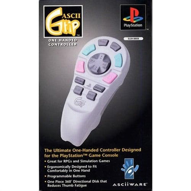 Agetec's ASCII Grip is een controller met één hand voor gebruik met compatibele software op de 1e generatie PlayStation en PS One. Drie verschillende selecteerbare knopconfiguraties maken een aangepaste gameplay mogelijk, terwijl programmeerbare knoppen combinaties onthouden, waardoor moeilijke bewegingen gemakkelijk worden. Bovendien is de massieve 360 directionele schijf uit één stuk ontworpen om vermoeidheid van de duim te verminderen. De controller is ideaal voor rollenspellen, simulatie-, sport- en strategiespellen.