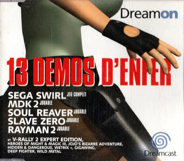 DreamOn: 13 Demos voor de Dreamcast is een demo-disc die een verzameling speelbare demo’s en trailers bevat van verschillende Dreamcast-games. Deze schijven werden vaak meegeleverd bij tijdschriften of consoles om spelers kennis te laten maken met nieuwe en aankomende titels. De exacte inhoud varieert per versie, maar kon onder andere demo’s bevatten van populaire games zoals Sonic Adventure, Crazy Taxi, Jet Set Radio en meer. DreamOn: 13 Demos bood Dreamcast-gebruikers de kans om verschillende games uit te proberen voordat ze deze aanschaften, een typisch kenmerk van het tijdperk van fysieke demo-discs.