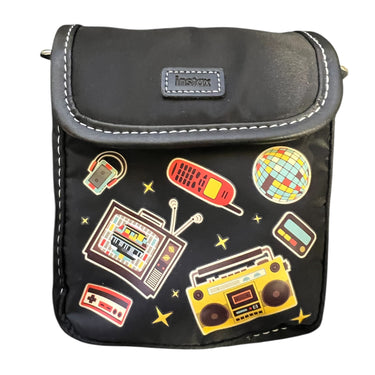 Deze instax Mini schoudertas met retro print is een stijlvolle en praktische draagtasje voor instax mini camera's, ideaal om je camera veilig mee te nemen en te beschermen tegen krassen en stof. De tas is gemaakt van stevig synthetisch materiaal in zwarte kleur met opvallende gekleurde retro iconen zoals een televisie, boombox en gamecontroller, en heeft een zachte voering aan de binnenkant voor extra bescherming.