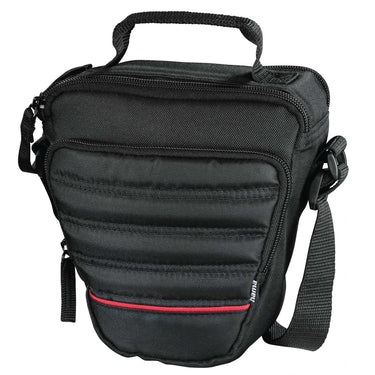 De Hama Syscase 110 Colt Camera Bag is een praktische cameratas voor het veilig opbergen en meenemen van een middelgrote digitale spiegelreflexcamera met zoomlens. Deze zwarte cameratas heeft een dubbele ritssluiting voor snelle toegang tot de camera, een voorvak met rits voor kleine accessoires zoals geheugenkaarten, kabels of een accu, en een verstelbare schouderriem voor comfortabel dragen. Door het compacte colt-model is deze tas geschikt voor fotografen die hun camera goed willen beschermen tegen stof, krassen en lichte stoten tijdens dagelijks gebruik of onderweg.