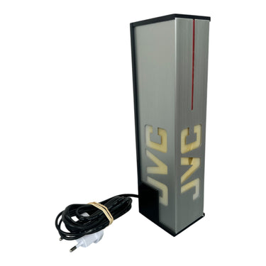 Deze JVC reclamelamp is een promotiemateriaal dat ooit in een JVC‑winkel werd gebruikt om het merk te benadrukken. De lamp toont het herkenbare JVC‑logo op een transparant of verlicht paneel, bevestigd op een lichtgevend of LED‑gebaseerd frame.