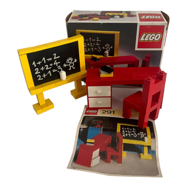 De LEGO Blackboard and School Desk - 291 is een vintage LEGO-set uit de jaren '70 en maakt deel uit van de Homemaker-serie, die bedoeld was om kinderen in staat te stellen verschillende kamers en meubels voor hun LEGO-huizen te bouwen. Deze set bevat onderdelen om een schoolbord en een schoolbank te creëren, waarmee kinderen een klaslokaalscène konden nabouwen. De set bestaat uit 42 onderdelen en bevat details zoals een schoolbank, een lessenaar en een krijtbord, waarmee een realistische leeromgeving kan worden nagebootst.