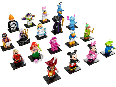 De LEGO Disney Minifiguren Serie 1 (71012) is een verzamelset uit 2016 bestaande uit 18 unieke minifiguren van iconische Disney-personages. Elke figuur wordt geleverd met een zwarte displayplaat en bijbehorende accessoires. De set bevat onder andere Mickey Mouse, Minnie Mouse, Donald Duck, Daisy Duck, Buzz Lightyear, Alien, Mr. Incredible, Syndrome, Peter Pan, Captain Hook, Ariel, Ursula, Aladdin, Genie, Alice, Cheshire Cat, Maleficent en Stitch. Deze complete serie is ideaal voor verzamelaars en fans van Disney en LEGO, en biedt een kleurrijke toevoeging aan elke collectie.