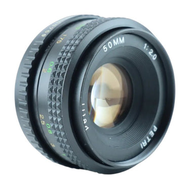 De Petri 50 mm F/2 is een compacte, handmatige scherpstel full‑frame lens uit de jaren 60–70, ontworpen voor Petri SLR‑camera’s (bajonet of M42‑mount). Deze heldere f/2‑lens is ideaal voor algemene fotografie, portretten en situaties met weinig licht. Dankzij de all‑metal behuizing weegt hij slechts zo’n 200 g en heeft hij een filtermaat van circa 52 mm. De optische constructie (5–7 elementen in 4 groepen) biedt scherpe beelden en zachte bokeh, al kan bij directe lichtinval soms enige lichtvervaging optreden. Door de klassieke, klikbare diafragma‑ring en vloeiende focusring voelt de lens degelijk aan. Veilig te gebruiken met M42‑adapter op digitale camera’s en compatibel met alle Petri SLR‑modellen uit die periode.