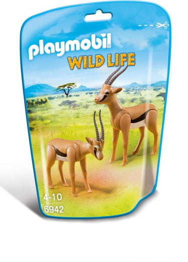 Playmobil 6942 Gazellen. Met de nieuwe Rangerpost voor gewonde dieren (art. 6939) van Playmobil breng je dieren uit heel de wereld in de kinderkamer. Dit Playmobil savanne thema kan worden aangevuld met 6 verschillende zakjes met diersoorten. In dit Playmobil setje zitten 2 Playmobil gazellen.