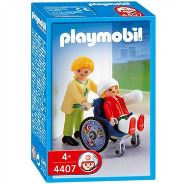 Playmobil 4407 Kind met rolstoel. Door een ongeluk zit het Playmobil kindje in een rolstoel. Haar moeder brengt haar naar huis. Dit setje wordt geleverd met verschillende soorten verbanden voor het kind. Op de wielen van de rolstoel staan vrolijke vissen afgebeeld. Inclusief 2 Playmobil speelfiguren.