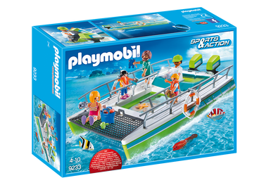 Kijk naar alle vissen in de zee met de Playmobil glasboot met onderwater motor. Leer alle vissen kennen. Als het te warm is kun je ook nog van de boot springen om te gaan zwemmen. Op het schip bevindt zich in het midden een transparante bodem. De schelpen en de zeesterren zijn plat genoeg om ze bij het spelen op het land onder de loep te houden.