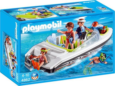 Neem de hele familie mee in deze ruime speedboot. Voorzien van laadruimte en vele leuke accessoires zoals snorkel-uitrusting, vader-, moederfiguur en twee kinderfiguren, strandlakens etc. De boot drijft en kan uitgerust worden met de PLAYMOBIL onderwatermotor (Art. 7350).
