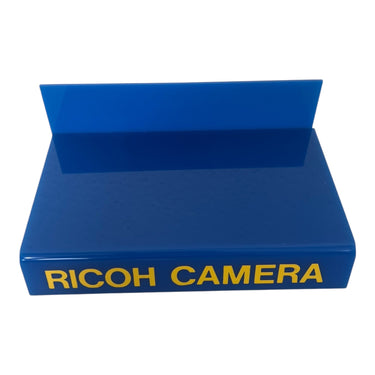 Zeldzame Ricoh Camera displaystandaard, uitgevoerd in blauw. Het minimalistische en moderne ontwerp maakt dit een opvallende winkeldisplay of decoratief object. Perfect geschikt voor het presenteren van een compactcamera, lens of accessoire.