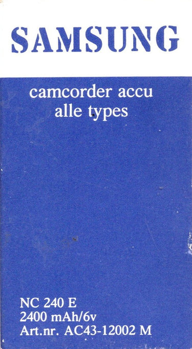 De NC-240 camcorderaccu is een 6 V Ni-MH batterij voor oudere Samsung camcorders, ook bekend als NB-E60 en SCA-12. Deze accu is compatibel met modellen zoals VP-A20, SC-K80, SC-L150, SC-X800 en SC-X804, en past in laders die de NC-240 / NB-E60-vormfactor ondersteunen.