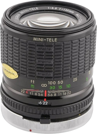 De Sigma Mini-Tele 135mm f/3.5 Multi-Coated is een compacte teleprime-lens voor Canon FD-vatting. Met zijn vaste brandpuntsafstand van 135 mm en een maximaal diafragma van f/3.5 is hij geschikt voor portretten en onderwerpen op middellange afstand. De lens heeft een metalen behuizing, ingebouwde zonnekap, meervoudige coating voor minder reflecties en een minimale scherpstelafstand van circa 1,4 meter. Ideaal voor liefhebbers van vintage lenzen die handmatig scherpstellen en klassieke beeldkarakteristieken waarderen.