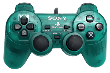 Controller voor de Playstation 1 met exclusieve dualshock technologie, wat een nieuwe dimensie qua trillingen geeft aan gameplay. De conntroller is in de kleur emerald green.