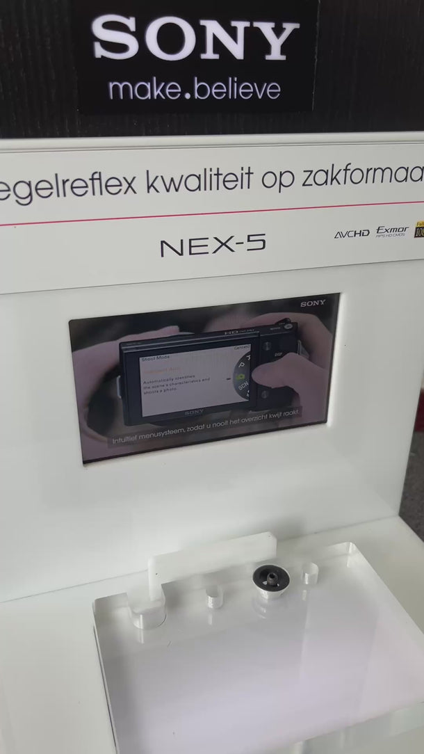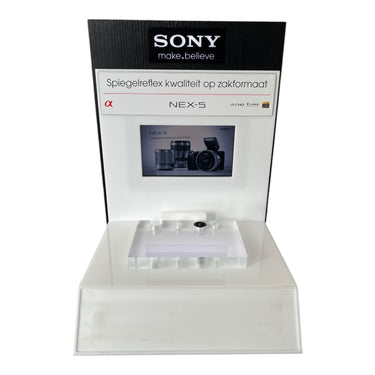 Perfect werkend, in zeer mooie conditie. Deze Sony winkel display met LED licht en geïntegreerd advertentie scherm is speciaal ontworpen voor het presenteren van de Sony NEX-5 systeemcamera in een retailomgeving. De display bestaat uit een stevige basis met transparante LED-verlichte houder waarin de camera geplaatst kan worden, en een prominent digitale display waarop promotievideo’s of productinformatie wordt afgespeeld. De opvallende Sony branding en het duidelijke tagline-paneel maken het geheel tot een aantrekkelijke presentatie-unit die de aandacht van winkelbezoekers trekt. Ideaal voor gebruik in fotozaken, elektronicawinkels of als verzamelobject voor liefhebbers van Sony apparatuur. Dit display is ontworpen voor het tonen van de NEX-5 maar kan ook gebruikt worden voor andere compatibele modellen of als decoratief item.