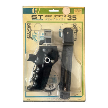De U.N ST Grip System 35 (U.N-591) is een multifunctioneel triggerhandvat en flitsbeugel, ontworpen voor gebruik met 35mm camera’s. Deze set uit Japan combineert een handgreep met ontspankabel (trigger) en een zijbeugel met statiefschroef, waarmee je het systeem op verschillende manieren kunt gebruiken: als camera grip voor stabielere bediening of als flitsbeugel voor bevestiging van een externe flitser. De metalen onderdelen en solide kunststofgreep zorgen voor een robuuste constructie die langdurig gebruik ondersteunt. De ontspankabel loopt via een mechanisch drukmechanisme vanaf de handgreep, wat snelle activering van de sluiter mogelijk maakt zonder de camera zelf aan te raken — ideaal bij gebruik van flitsers of lange sluitertijden.